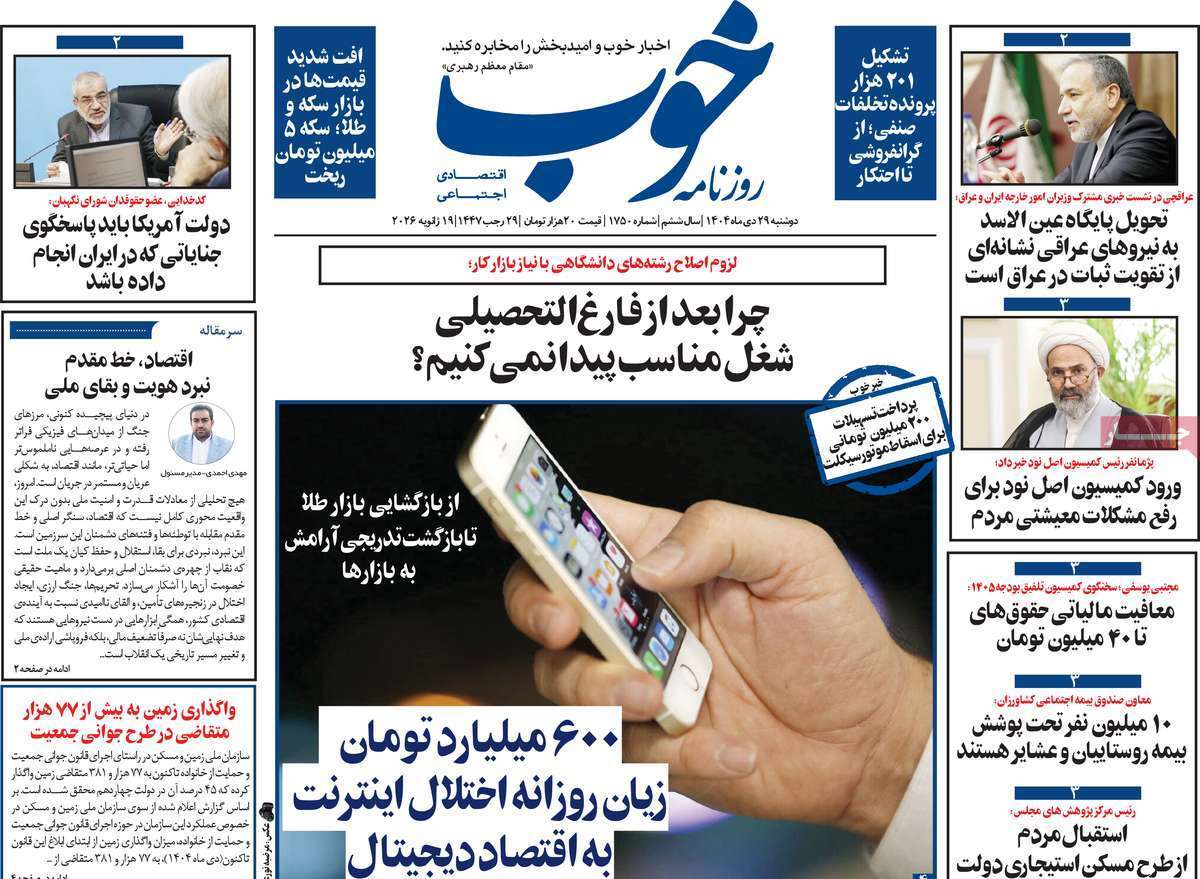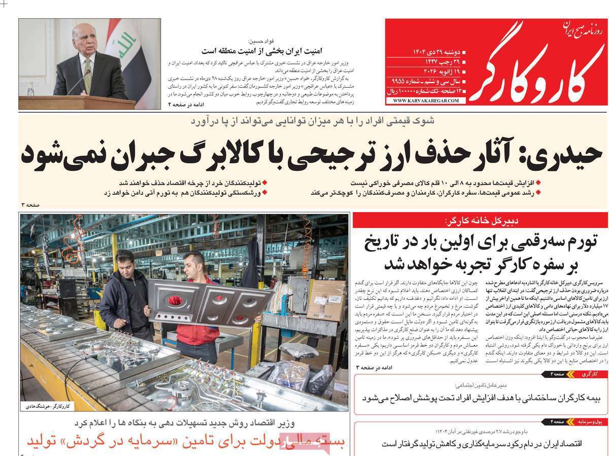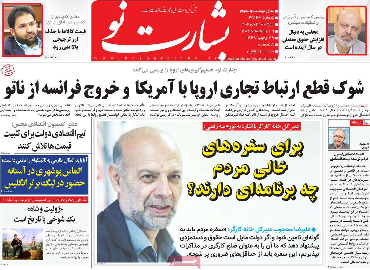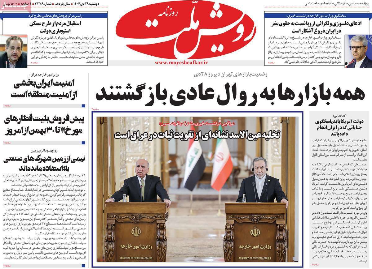 صفحات نخست روزنامههای دوشنبه ۲۹ دی ۱۴۰۴ را که به موضوعاتی، چون تعرض به رهبری جنگ تمام عیار با ملت ایران، فصل جدید روابط ایران و عراق، پروژه ایرانکشی و مهمترین رویدادهای ورزشی پرداختهاند؛ مشاهده میکنید.