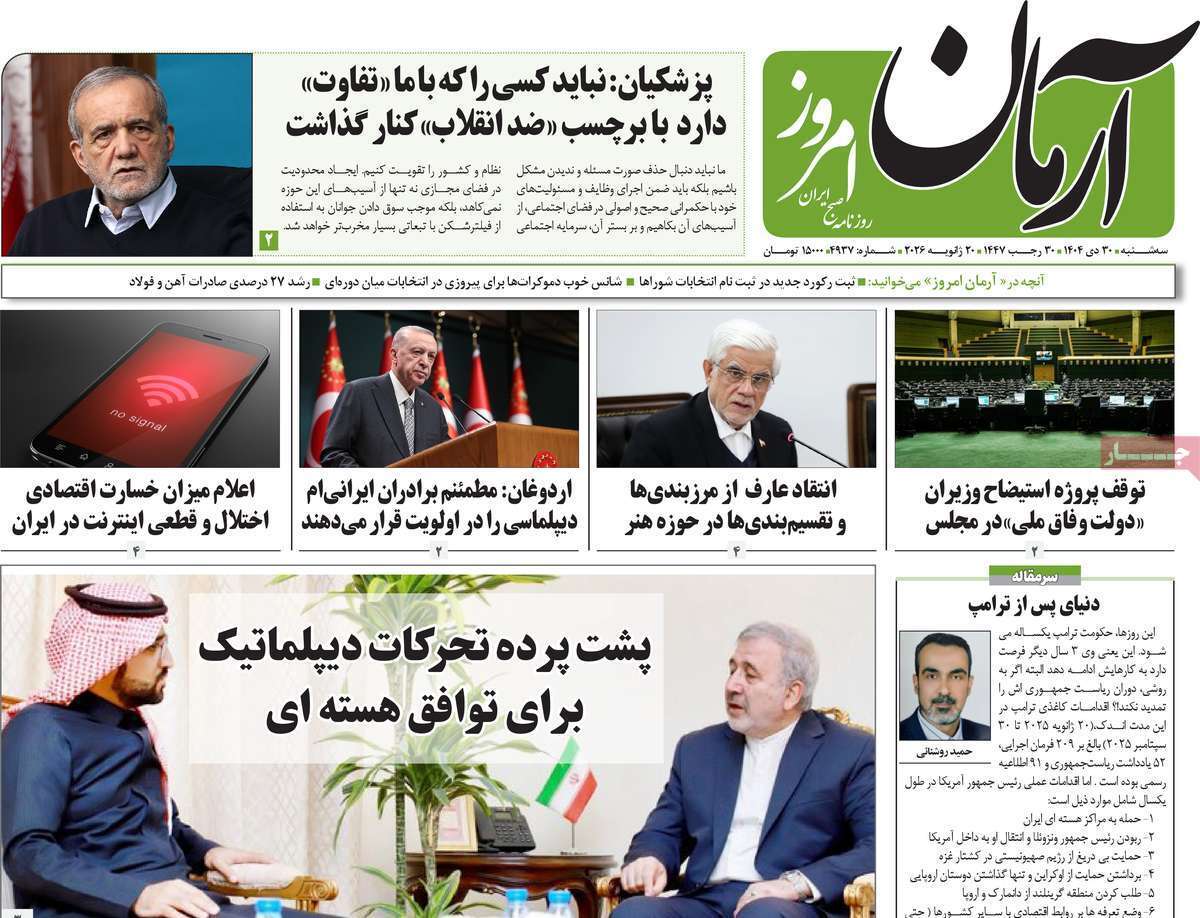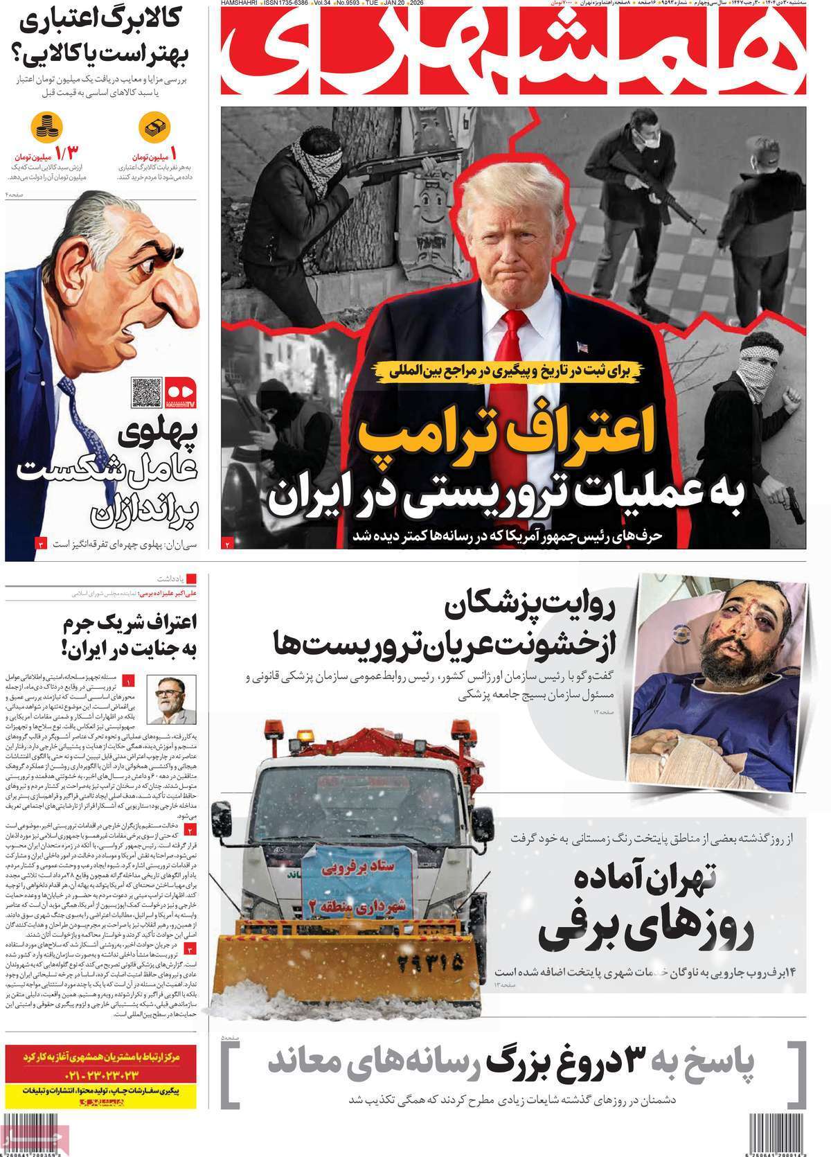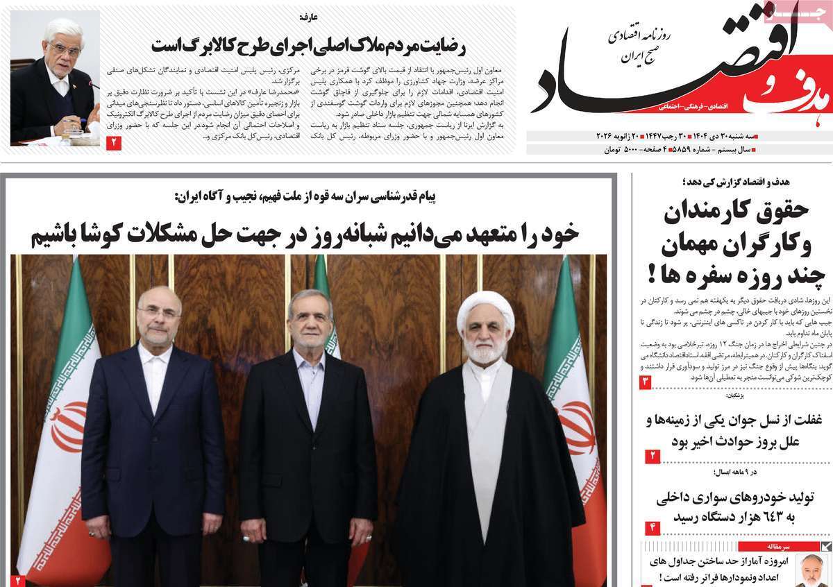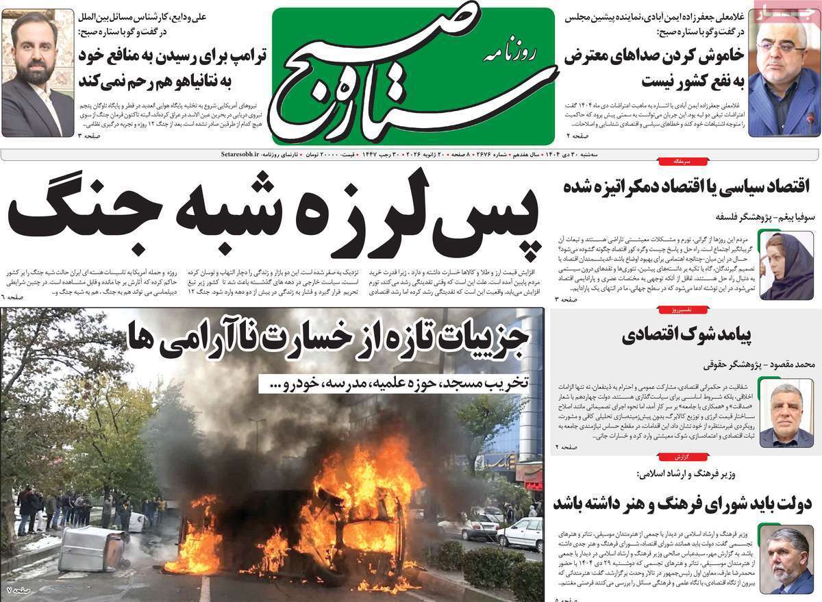 صفحات نخست روزنامههای سهشنبه ۳۰ دی ۱۴۰۴ را که به موضوعاتی، چون وحدت عملی برای حل مشکلات مردم، پس لرزه شبهجنگ، اعتراف ترامپ به عملیات تروریستی در ایران و مهمترین رویدادهای ورزشی پرداختهاند؛ مشاهده میکنید.
