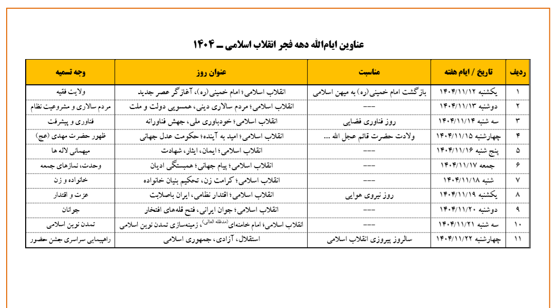 عناوین ایام الله ستاد دهه فجر انقلاب اسلامی 1404