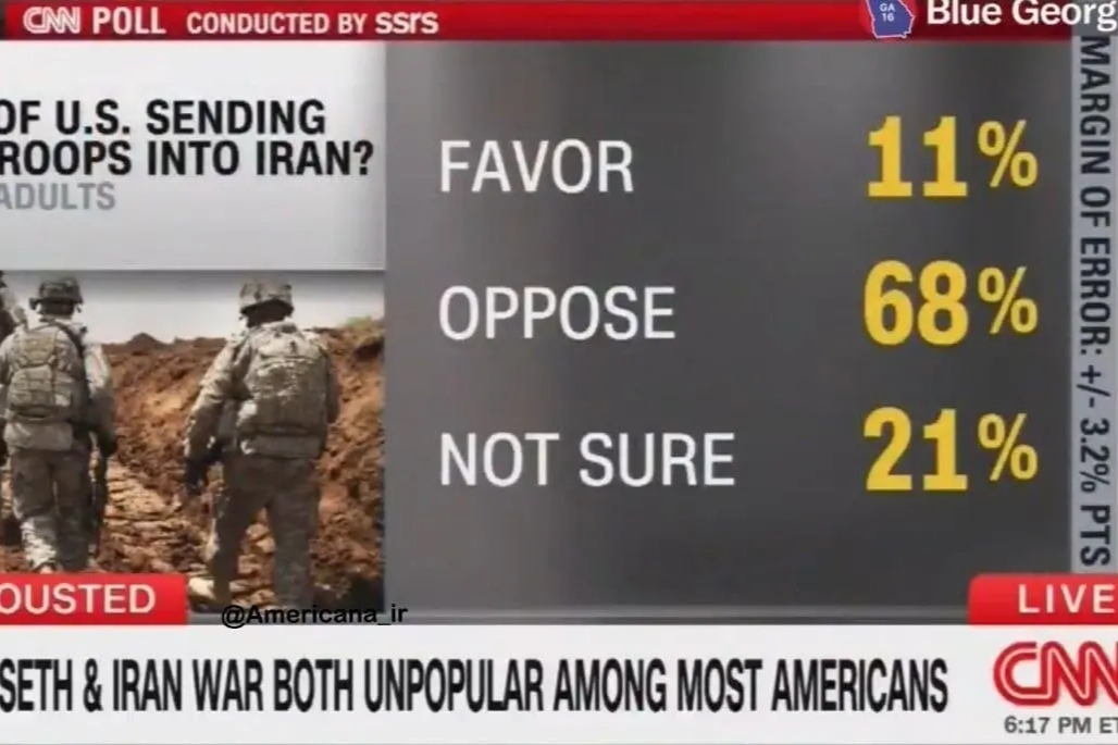 به گزارش ایکنا، سی‌ان‌ان نظرسنجی جدیدی از مردم آمریکا درباره جنگ زمینی با ایران تهیه کرده است که نتایج آن به این شرح است: