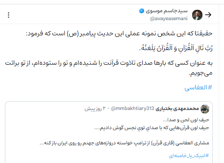 به گزارش ایکنا، در پی انتشار یک پیام توییتری جنجالی از سوی «راشد العفاسی» مُرَتِّل و خواننده آواهای دینی که در آن از ترامپ، رئیسجمهور آمریکا خواسته است «دروازههای جهنم را به روی ایران بگشاید»، موجی از انتقادات در محافل قرآنی و رسانههای ایران و مسلمانان جهان شکل گرفته است. پیش از این نیز مواضعی خصمانه را از العفاسی درباره ملت یمن به خاطر داریم.