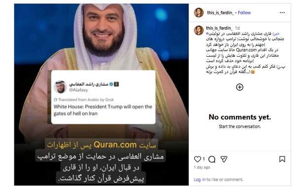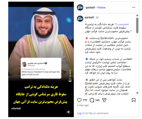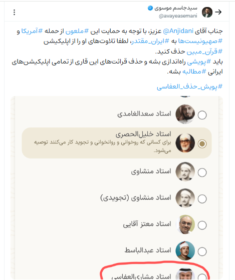 در همین راستا، مطالبهای برای راهاندازی یک پویش سراسری با هدف حذف تلاوتهای «مشاری راشد العفاسی» از نرمافزارها و سکوهای (پلتفرمها) از سوی جامعه قرآنی کشورمان شکل گرفته است.