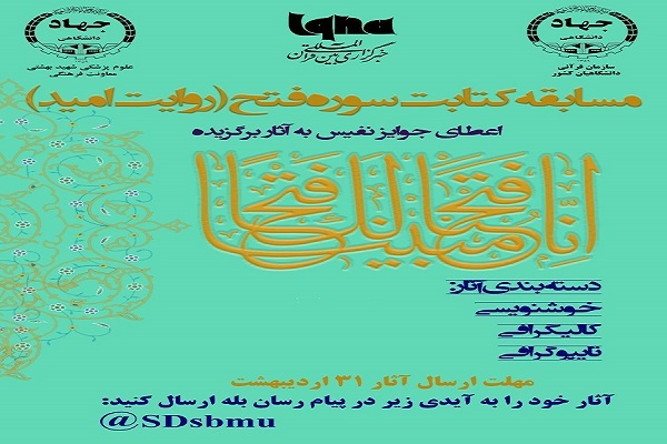 ایکنا، در پی حمله وحشیانه استکبار جهانی به ایران و شهادت جمعی از مردم و مسئولین کشور، مسابقه «کتابت سوره فتح» با همکاری سازمان قرآنی دانشگاهیان کشور و به همت معاونت فرهنگی جهاد دانشگاهی علوم پزشکی شهید بهشتی با روایتی هنری از امید، نصرت و وعده الهی برگزار میشود.