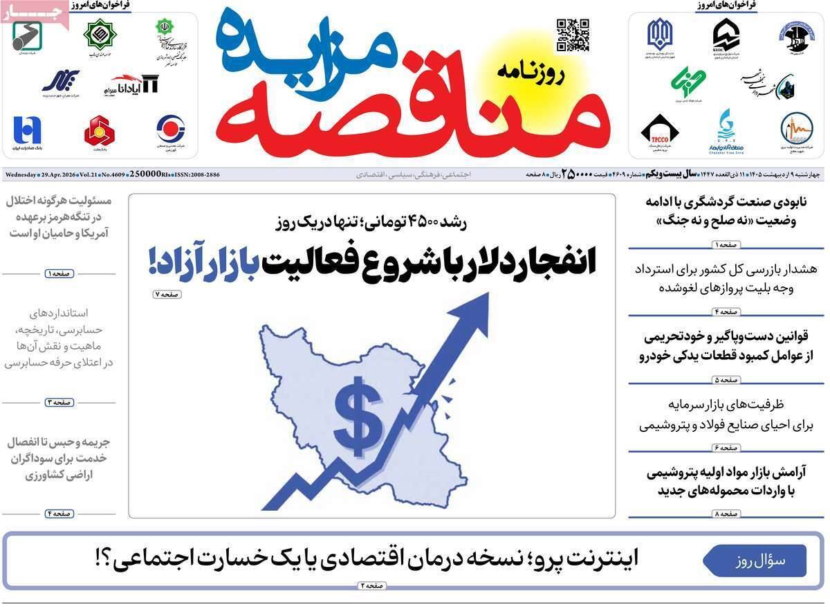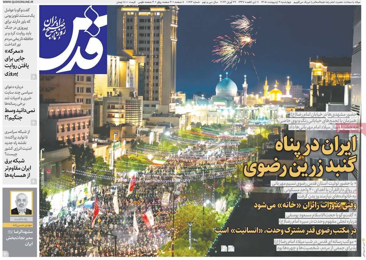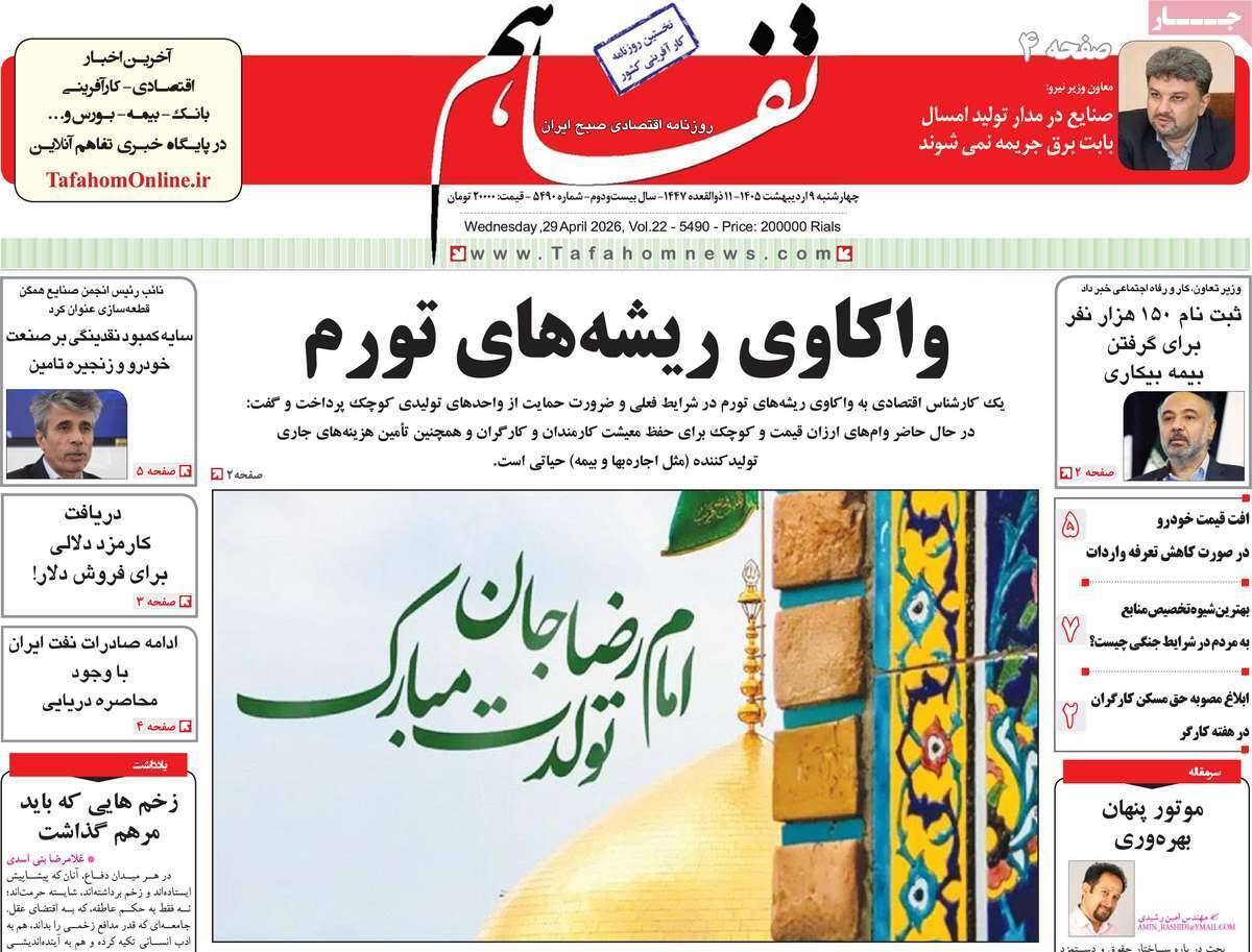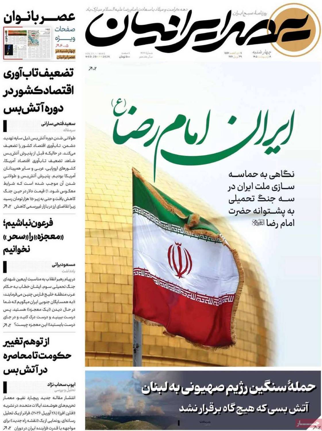 صفحات نخست روزنامههای چهارشنبه ۹ اردیبهشت ۱۴۰۵ را که به موضوعاتی چون، ایران در پناه امام رضا(ع)، سونامی قیمت در بازار خودرو، واکاوی ریشههای تورم و مهمترین رویدادهای ورزشی پرداختهاند؛ مشاهده میکنید.
