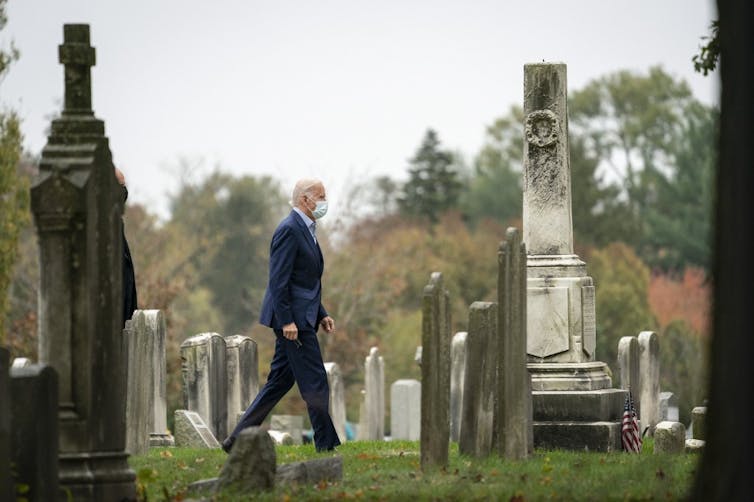 Le 1ᵉʳ novembre 2020, dernier dimanche avant la présidentielle, Joe Biden se rend à l’église catholique romaine de Brandywine (Wilmington, Delaware) pour assister à l’office dominical. Drew Angerer/AFP