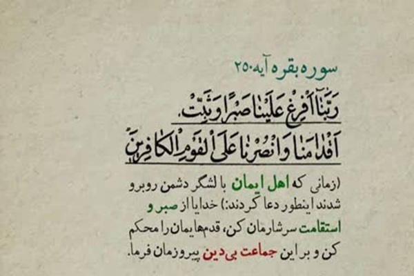 «رَبَّنَا أَفْرِغْ عَلَیْنَا صَبْرًا وَثَبِّتْ أَقْدَامَنَا وَانْصُرْنَا عَلَى الْقَوْمِ الْکَافِرِینَ»