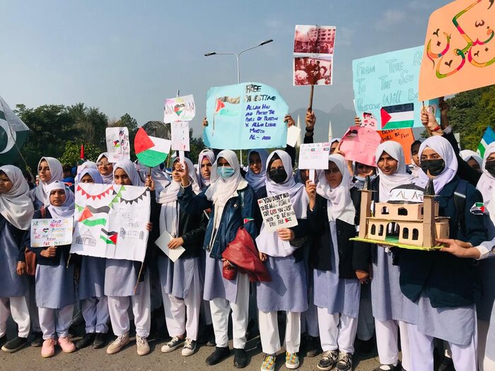 ایکنانیوز د ایرنا له قوله راپور راکړ،د پاکستان په اسلام اباد کې د د زرګونو زده کونکو ،ماشومانو او زلمیانو په شتون سره د غزې له میئندو او ماشومانو سره د پیوستون لویه غونډه ترسره شوه،ګډون کونکو پکې د مړه دې امریکا او مړۀ دې اسرائيل او لبیک یااقصی چغې پورته کړې.