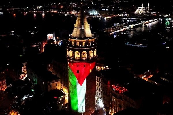 Kültür ve Turizm Bakanlığı, Gazze’de yaşanan soykırıma dikkat çekmek amacıyla Galata Kulesi’ne Filistin bayrağı yansıtıldı.