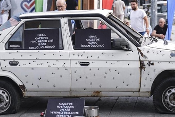 Gazze Mahkemesinin (Gaza Tribunal) Vezneciler Metro İstasyonu’na temsili olarak koyduğu, Hind Receb’in katledildiği arabayı tanıtmak için gönüllü olan Ayşe Hümeyra Gül, “Biz Hind Receb’in hikayesi için buradayız. Hind Receb ailesiyle birlikte 29 Ocak 2024 tarihinde tam 355 merminin hedef aldığı bu temsili araçta şehit edildi.” dedi.