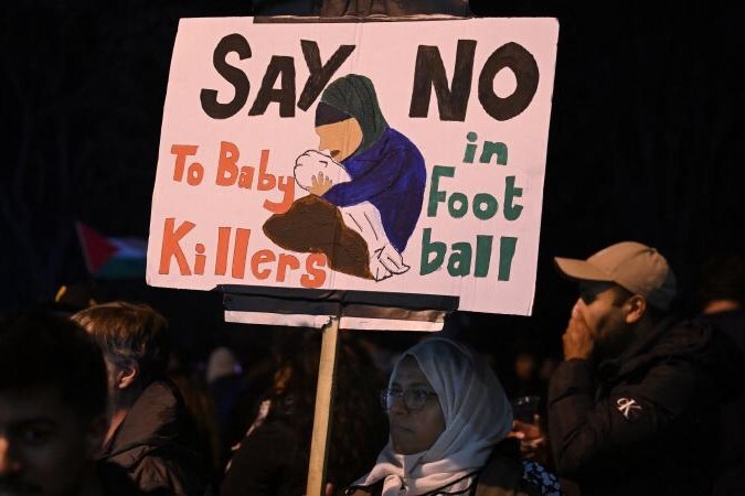 Sık sık "Özgür Filistin" sloganı atan ve stadın önüne dev Filistin bayrağı açan göstericiler, "İsrail'i silahlandırmayı durdurun", "Gazze'yi aç bırakmayı durdurun", "İsrail'i FIFA'dan atın", İsrail'e kırmızı kart" ve "Soykırımı durdurun" yazılı pankartlar taşıdı.
