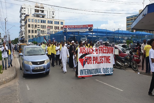 In Mombasa, eastern Kenya, people who attended the demonstration carried placards and chanted slogans in support of Palestine.