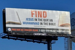 The billboard on Interstate 45, southeast of downtown Dallas, features the message: "Find Jesus in the Quran, Muhammad in the Bible."