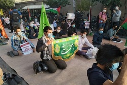 The demonstrators chanted slogans against French officials and the world arrogance and denounced desecration of Islamic sanctities in France.