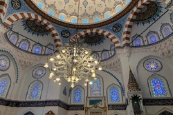 Inside, a large chandelier and brilliant stained-glass windows welcome visitors to the domed hall, which can house up to 2,000 people at once.