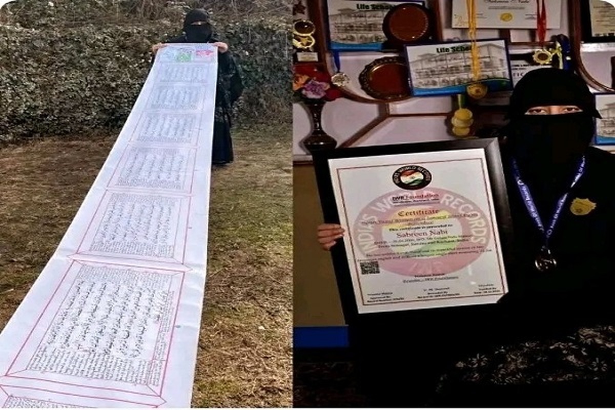 The 20-year-old Sabreena Nabi hailing from Charar-e-Sharief area in Budgam has left a remarkable mark in the world of calligraphy by writing Surah Yusuf along with its translated version in English and Urdu on a single scroll measuring 15.5 meters.