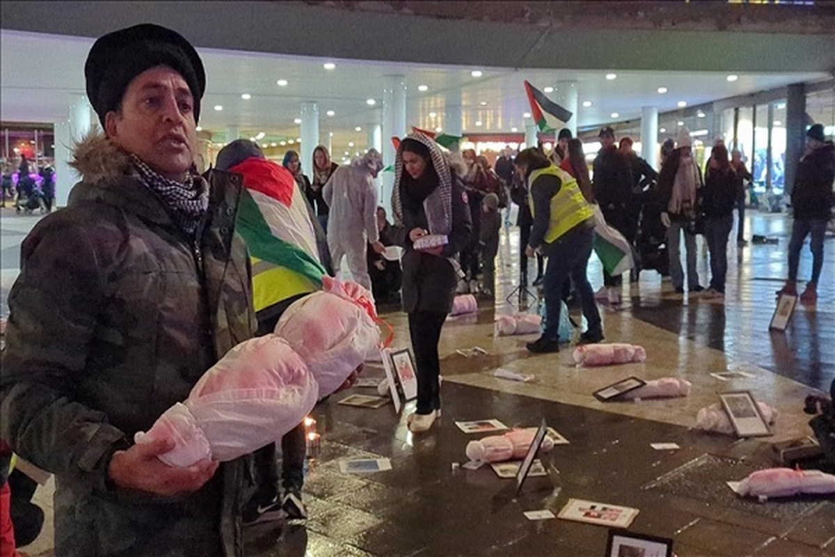Gathering at Sergels torg in the Swedish capital on Friday, the crowd protested Israeli attacks by chanting pro-Palestine slogans, including "Free Palestine" and "End the occupation."