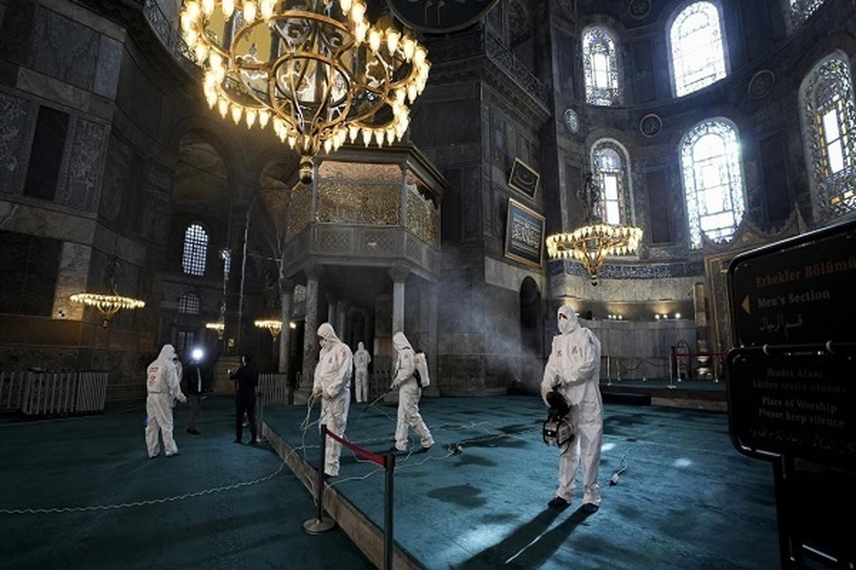 Carpets were vacuumed, shoe racks and the interior of the mosque were sprayed with disinfectant. The ablution fountain, mosque courtyard and Hagia Sophia Square were washed with hot water and disinfectant. After the cleaning process, rose water was sprayed inside and outside the mosque – a traditional method that dates back to the Ottoman Empire era.