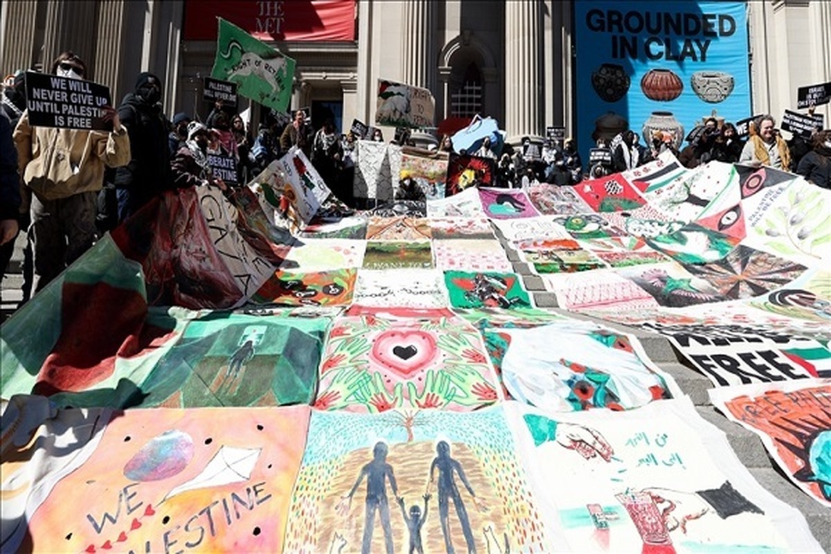 Protesters covered the steps of New York's Metropolitan Museum of Art with a large patchwork blanket on Sunday displaying messages of solidarity with Palestine to draw attention to Israel's war on the Gaza Strip.