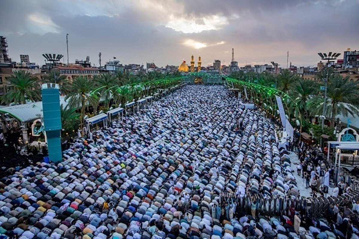The Eid prayers were performed at the holy shrines of Imam Hussein (AS) and Hazrat Abbas as well as Bain-ul-Haramain, the area between the two holy mausoleums.