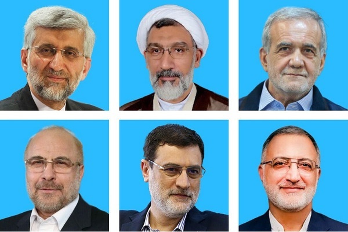 The presidential hopefuls are Saeed Jalili, Alireza Zakani, Amir Hossein Qazizadeh Hashemi, Mostafa Pourmohammadi, Mohammad Baqer Qalibaf, and Masoud Pezeshkian.