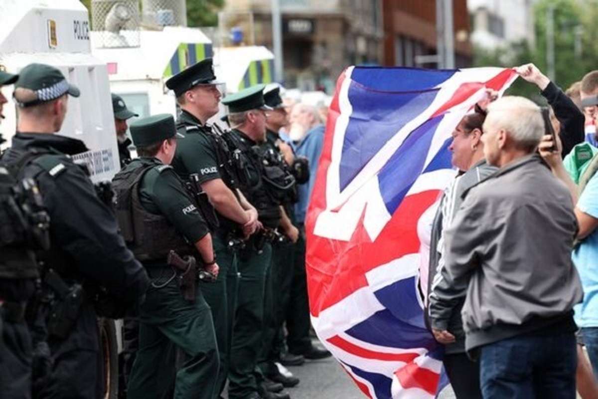 PSNI Land Rovers and officers in riot gear were separating the two groups.