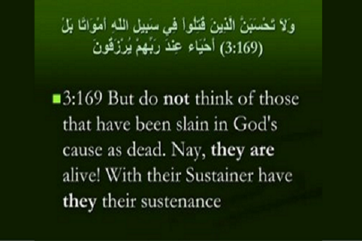 In Arabic, the word Shaheed (martyr) means one who is present and witnesses. A martyr is called Shaheed in Arabic because, although we think he is dead, he is present, witnessing us, and will testify to our deeds on the Day of Resurrection.