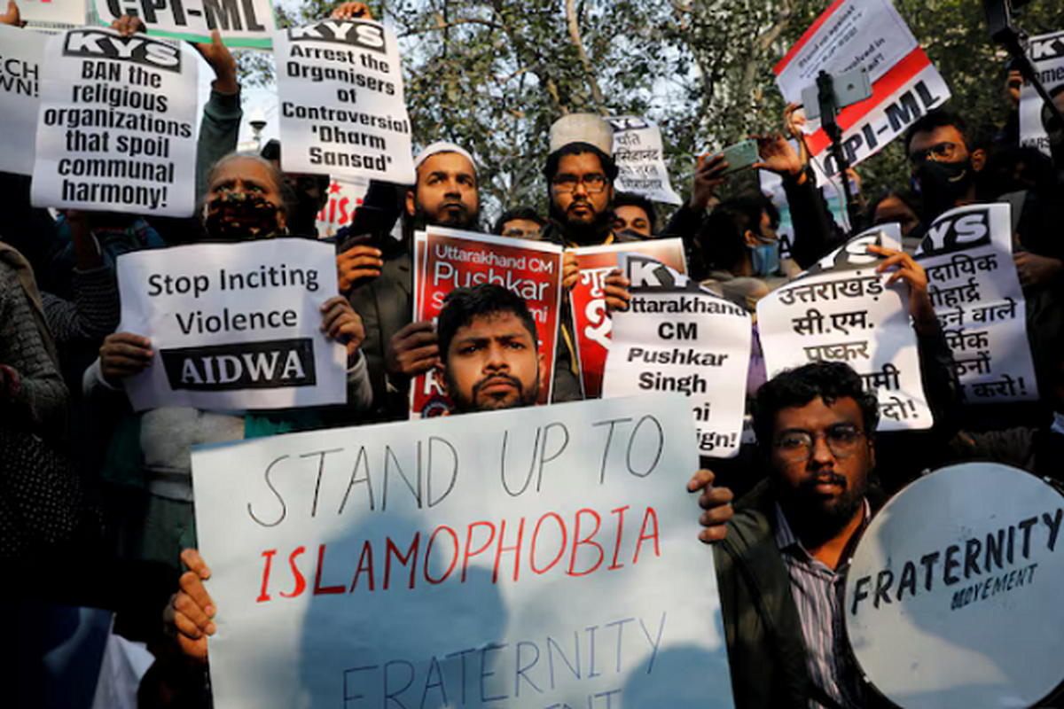 Demonstrators hold placards during a protest against hate speech against Muslims by Hindu leaders, in New Delhi, India, December 27, 2021
