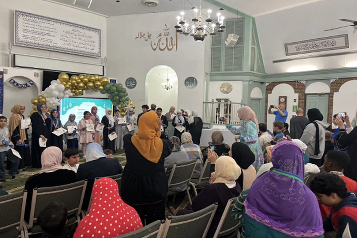 People gathered inside a mosque in east Charlotte, seated or lined up, wearing colorful blue and purple hijabs. Amani Kerrouchi, 11, sported a pink hijab as she waited for her name to be called at the award ceremony.