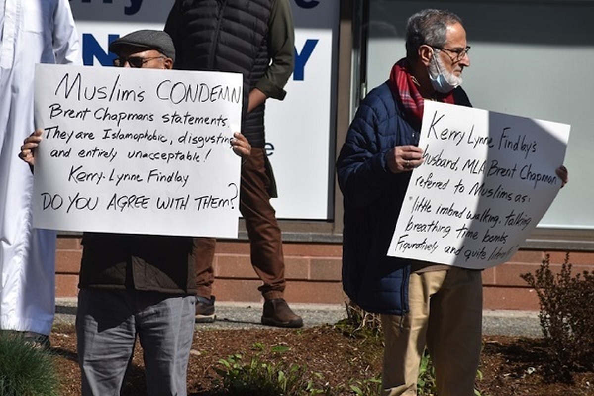 Holding signs with questions such as 'Does your silence mean you agree with your husband's racist statements?' and 'Why won't Kerry-Lynne Findlay speak out against hate speech?', members of the Muslim community took their questions to the office, but Findlay was not present at the time.