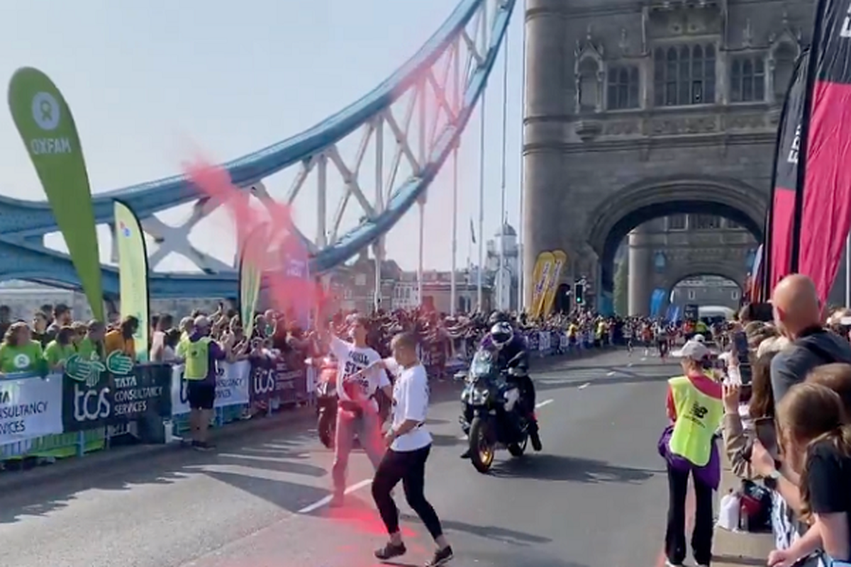 Two members of Youth Demand, a youth-led civil resistance group in the UK, jumped over barriers near Tower Bridge and threw red powder paint in front of the runners.