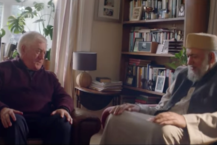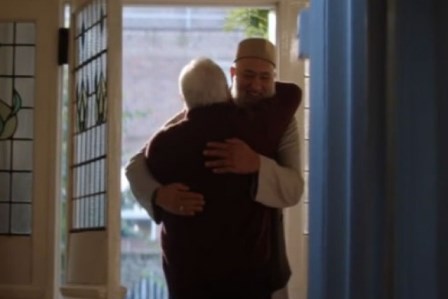 دوستش، یک روحانی مسلمان، باز میکند، یکدیگر را در آغوش میگیرند و با صرف یک