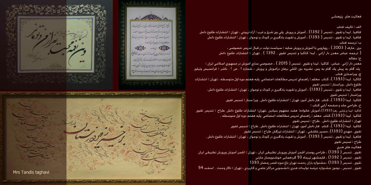 ایکنا: ابتدا خودتان را به طور کامل معرفی کنید و بفرمایید که چند سال است که در عرصه خوشنویسی فعال هستید؟ ـ تقدیس تقوی هستم متولد 1352/1/1 در «قائمشهر» مازندران، کاردانی حرفه و فن، کارشناسی گرافیک و کارشناسی ارشد مطالعات زنان دارم و درجه فوق ممتاز در رشته نستعلیق را از انجمن خوشنویسان ایران دریافت کردهام.
