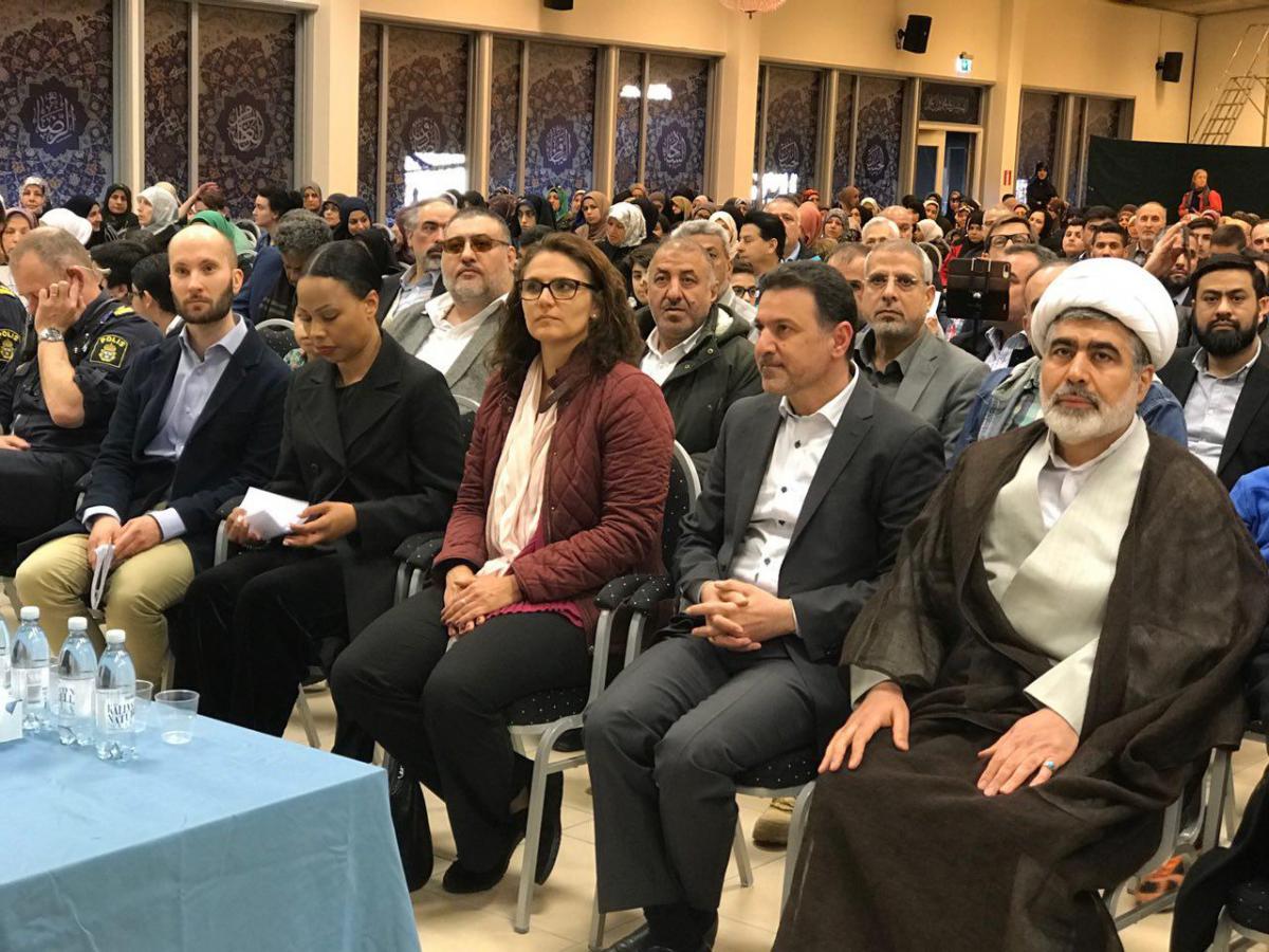 در این مراسم که با تلاوت آیاتی از کلامالله مجید آغاز شد، خانم Alice Bah Kuhnke، وزیر وزارتخانههای فرهنگ و دموکراسی سوئد و نیز رئیس پلیس منطقه جارفالا که مرکز اسلامی امام علی(ع) در آنجا واقع شده است و معاون رئیس پلیس شهر استکهلم در جمع حاضران سخنرانی کردند.