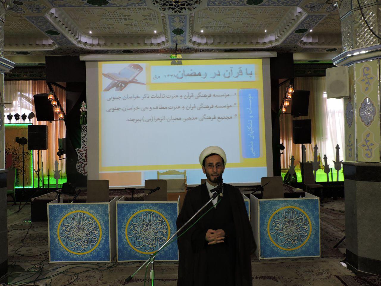 وی ادامه داد: اجرای طرح ملی «جشن رمضان»، اجرای برنامه با قرآن در رمضان، برپایی مراسم جزء‌خوانی قرآن همه روزه ساعت ۱۸:۱۵ تا۱۹:۳۰در مجتمع فرهنگی ـ مذهبی محبان‌الزهرا(س) بیرجند با همکاری اداره‌کل فرهنگ و ارشاد اسلامی استان، اداره تبلیغات اسلامی شهرستان، مؤسسه مطاف وحی خراسان جنوبی و اداره‌کل بنیاد شهید و امور ایثارگران استان از جمله این برنامه‌ها بود.