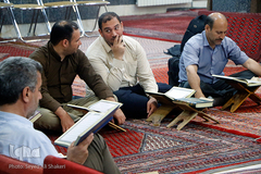 پس از اقامه نماز جماعت مغرب و عشاء و در ابتدای جلسه، محمد خواجوی از ادامه درس جلسه هفته گذشته، آیاتی از کلام الله مجید را تلاوت کرد. سپس، اعضای جلسه به تلاوت پرداختند و این استاد پیشکسوت، نکات تجویدی و صوت و لحنی آنها را متذکر میشد. در این جلسه هر هفته یک صفحه معین میشود و اعضای جلسه، در طول هفته روی این یک صفحه تمرکز لازم را انجام میدهند و در جلسه به مباحثه مباحث تفسیری و تدبری آیات به زبان ساده میپردازند.