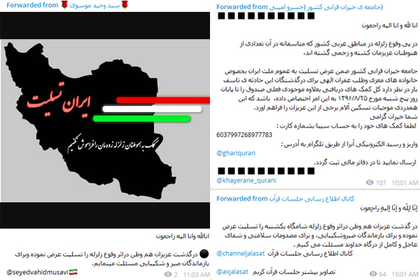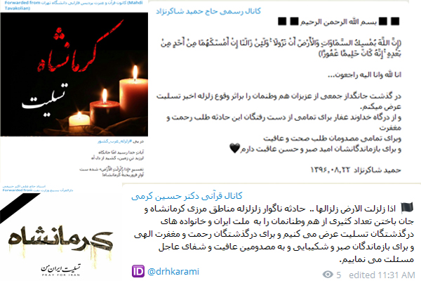 خبرگزاری بین المللی قرآن(ایکنا) در پی وقوع زمینلرزه در مناطق غربی کشور و جان باختن و مجروح شدن تعدادی از هموطنان در استانهای غربی، جمعی از قاریان کشور در شبکههای اجتماعی، وقوع این حادثه را تسلیت گفتند.