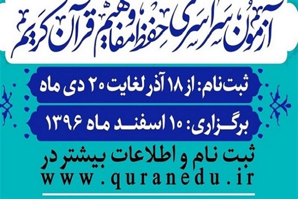 یادآور میشود، آزمون سراسری حفظ و مفاهیم قرآن کریم با مشارکت و همکاری معاونت قرآن و عترت وزارت فرهنگ و ارشاد اسلامی و سازمان اوقاف و امور خیریه پنجشنبه، 10 اسفندماه در سراسر کشور برگزار میشود. همچنین طبق روال هرساله، پیشبینی میشود بازه زمانی ثبتنام در این آزمون تمدید شود.