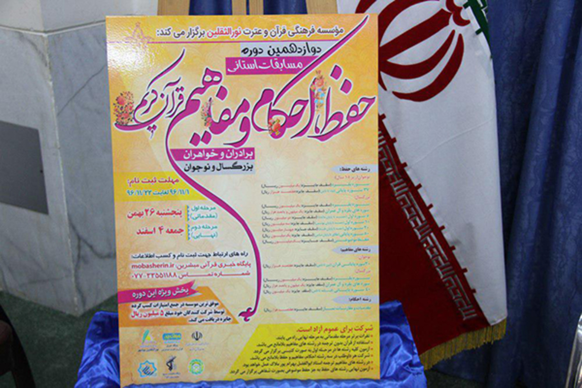 يادآور می‌شود: در اين آئين از پوستر دوازدهمين دوره مسابقات استانی حفظ، احكام و مفاهيم قرآن كريم ويژه بزرگسالان و نوجوانان توسط آيت‌الله غلامعلی صفايی بوشهری، نماينده رهبر معظم انقلاب اسلامی در استان و امام جمعه بوشهر و حيدر ساجدی، سرپرست معاونت سياسی امنيتی اجتماعی استانداری بوشهر رونمايی شد.