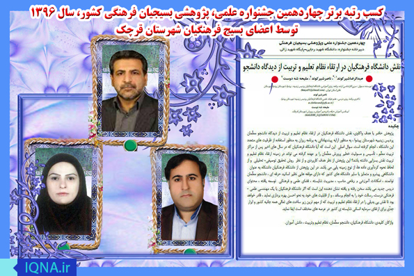 عبدالرضا شیرکوند، ناصر شیرکوند و ملیحه شهدوست از اعضای کانون بسیج فرهنگیان قرچک با ارائه مقالهای با موضوع «نقش دانشگاه فرهنگیان در ارتقای نظام تعلیم و تربیت» در جمع خالق 36 اثر برگزیده قرار گرفتند.