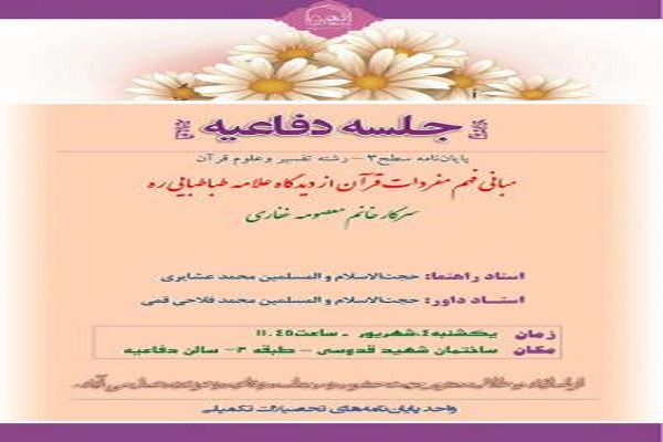 این جلسه روز یکشنبه، ۴ شهریورماه ساعت ۱۱:۴۵ در سالن دفاعیه طبقه سوم ساختمان شهید قدوسی(ره) جامعةالزهرا(س) برگزار میشود.