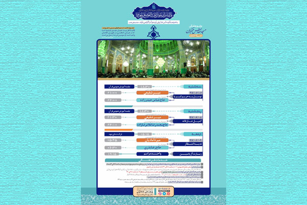 یادآور میشود، جلسه آموزش عمومی قرآن در روزهای سهشنبه و پنجشنبه از ساعت 18:30 و مراسم قرائت زیارت آل یاسین نیز عصر جمعه در ساعت 19 برگزار میشود.