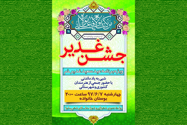 به گزارش کانون خبرنگاران ایکنا، نبأ؛ مراسم جشن عید غدیر خم امشب، هفتم شهریورماه، ساعت 20 در بوستان خانواده شهر پیشوای ورامین برگزار میشود.