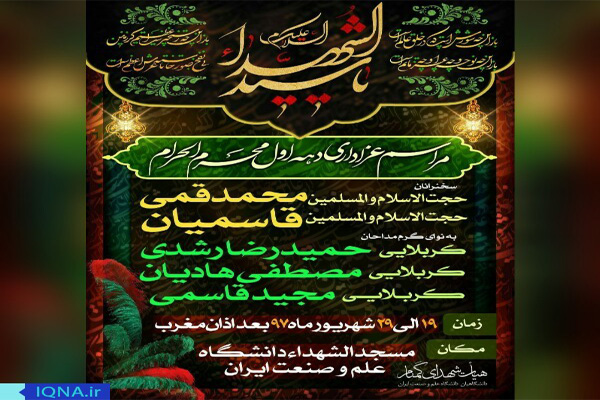 به گزارش کانون خبرنگاران ایکنا، نبأ؛ مراسم عزاداری دهه اول محرم‌الحرام با سخنرانی حجج اسلام محمد قمی و قاسمیان، و ذکر مصیبت و مدیحه‌سرایی حمیدرضا رشدی، مصطفی هادیان و مجید قاسمی از ۱۹ تا ۲۹ شهریورماه بعد از اقامه نماز مغرب و عشا در مسجد الشهدای دانشگاه علم و صنعت ایران برگزار می‌شود.