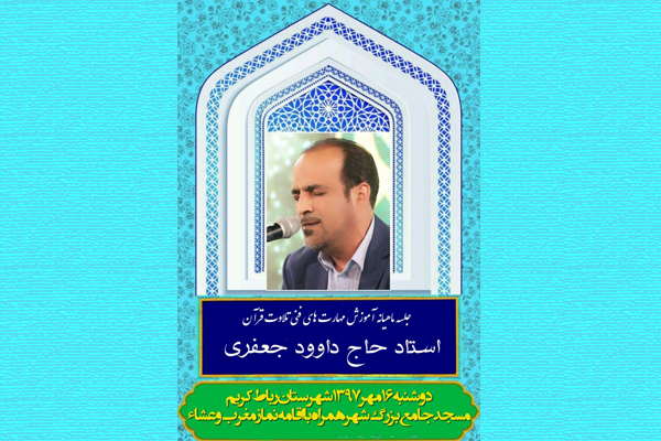 به گزارش کانون خبرنگاران ایکنا، نبأ؛ جلسه ماهیانه آموزش مهارتهای فنی تلاوت قرآن کریم توسط داود جعفری، مدرس و قاری قرآن امروز، 16 مهرماه بعد از اقامه نماز مغرب و عشا در مسجد جامع شهرستان رباط کریم برگزار میشود.