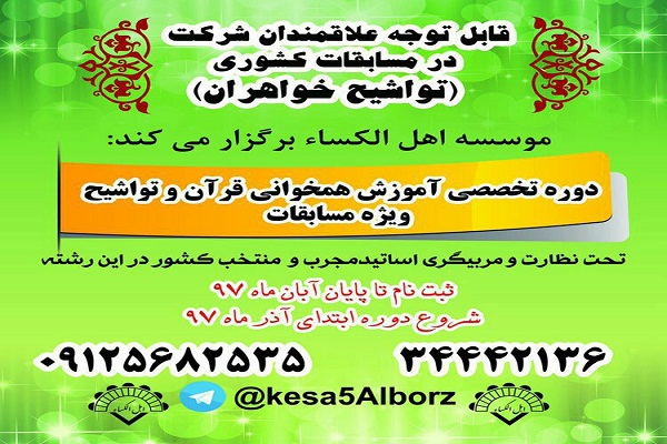 وی در پایان گفت: علاقهمندان برای شرکت در این کلاس آموزشی میتوانند با شمارههای 09125682535 و 34442163 تماس بگیرند و یا به کانال تلگرامی kesa5Alborz@ مراجعه کنند.