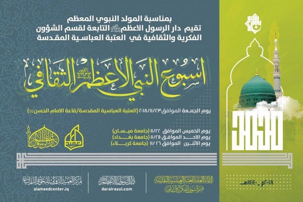 ایکنا به نقل از وبسایت شبکه جهانی کفیل؛ دار الرسول الاعظم (ص) وابسته به آستان عباسی در عراق، از تصمیم خود برای برگزاری نخستین هفته فرهنگی رسول اعظم(ص) به مناسبت ولادت پیامبر(ص) خبر داد.
