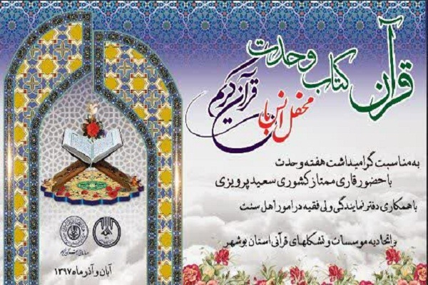 گروه مؤسسات قرآنی مردم‌نهاد ــ محفل انس با قرآن به نام «کتاب وحدت» با همکاری دفتر نمایندگی ولی‌فقیه در امور اهل سنت و به همت اتحادیه موسسات و تشکل‌های قرآنی بوشهر برپا می‌شود.