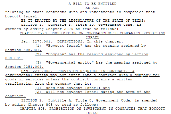 بنا بر قانون «ضد تحریم اسرائیل» که سال گذشته در ایالت تگزاس به تصویب رسید، عقد قرارداد با شرکتهایی که معامله با اسرائیل را تحریم میکنند ممنوع شده است.
