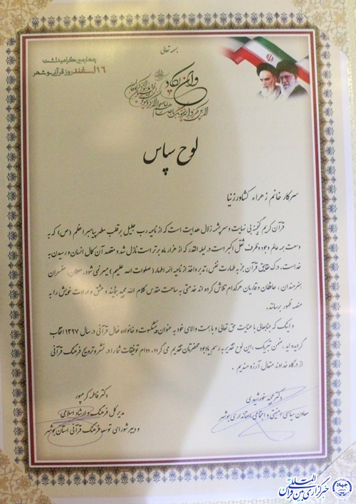 گزارش ایکنا حاکی است، در این آئین از زهرا کشاورزنیا، مؤسسه فرهنگی قرآن و عترت طاها شهرستان بوشهر و در جایگاه خانواده فعال قرآنی از سیداسدالله حسینی، استاد دورههای آموزشی قرآن با حضور دبیر شورای فرهنگ عمومی و معاون سیاسی استانداری بوشهر تجلیل به عمل آمد.