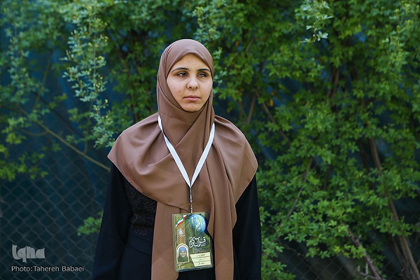 فاطمه یونس، حافظ روشندل لبنانی در حیاط هتل «هما»؛ محل برگزاری مسابقات قرآن بانوان